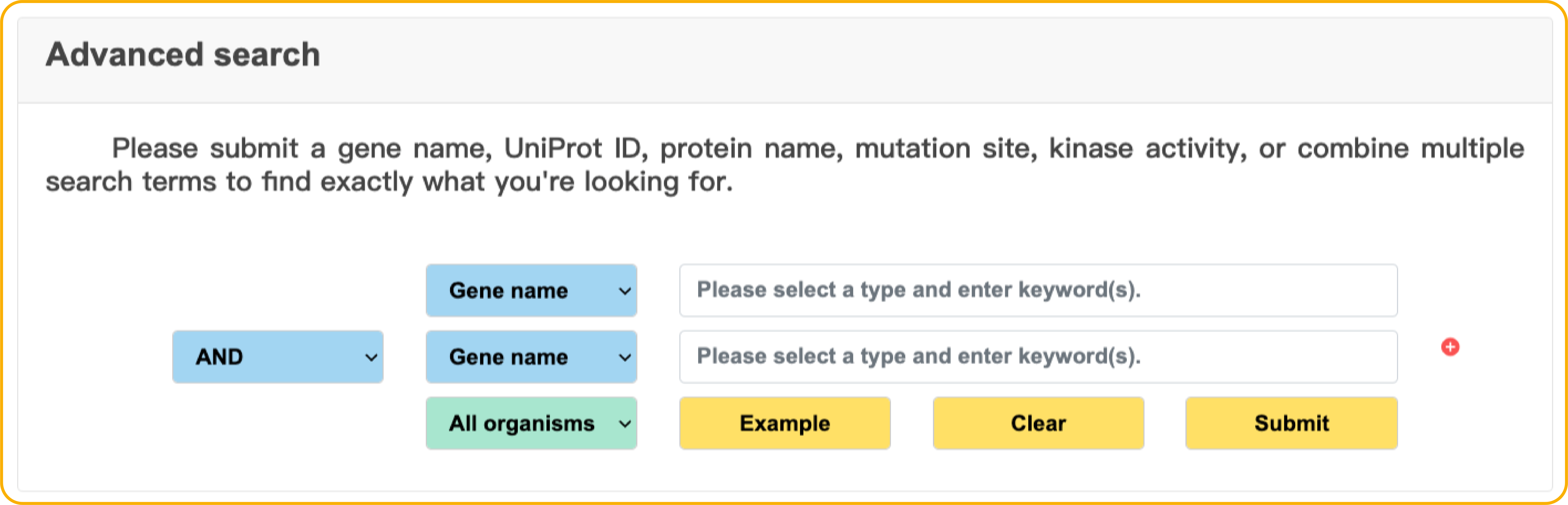 In the Search page, users can add more keyword boxes and choose 'AND', 'OR' or 'NOT' to perform a more accurate multiple keywords search. Users can simply click example and submit buttons to perform an example search.