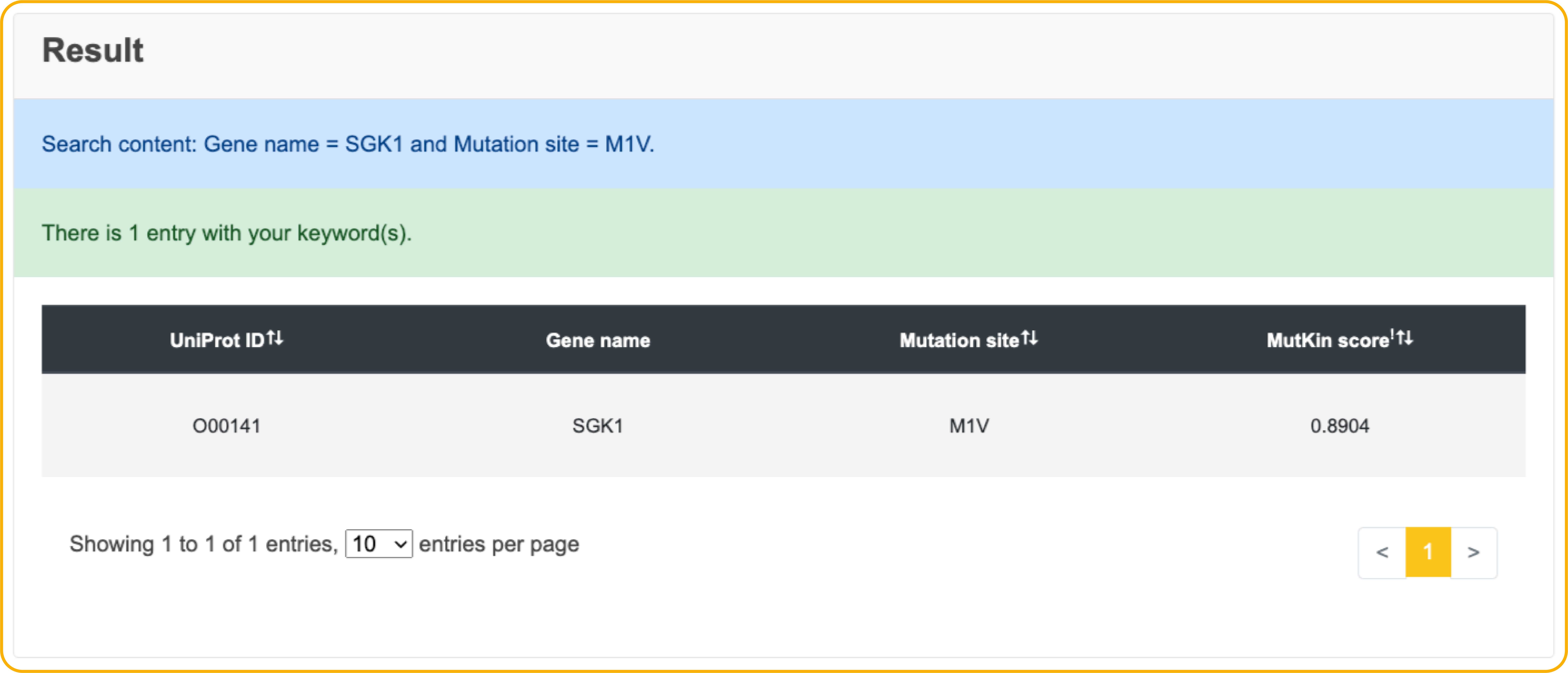Researchers can perform direct searches to obtain KAKA predictions.The prediction score was scaled between 0 and 1, representing the categorical probability of whether the mutation has an effect on kinase activity.